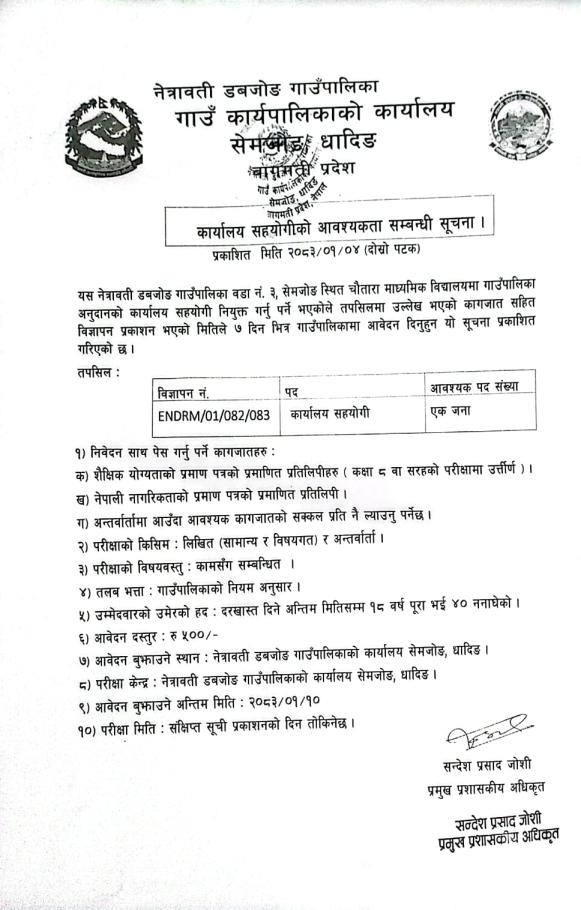 कार्यालय सहयोगी आवश्यकता सम्बन्धी सूचना।