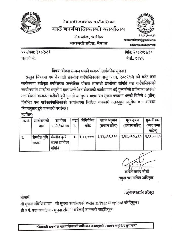 योजना सम्पन्न भएको सम्बन्धी सार्वजनिक सूचना