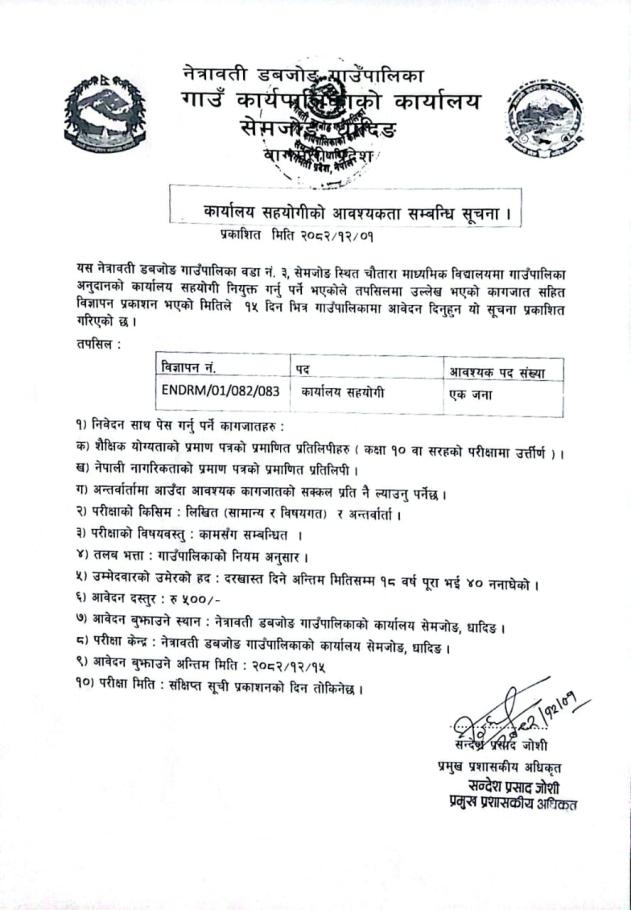 कार्यालय सहयोगी आवश्यकता सम्बन्धी सूचना।