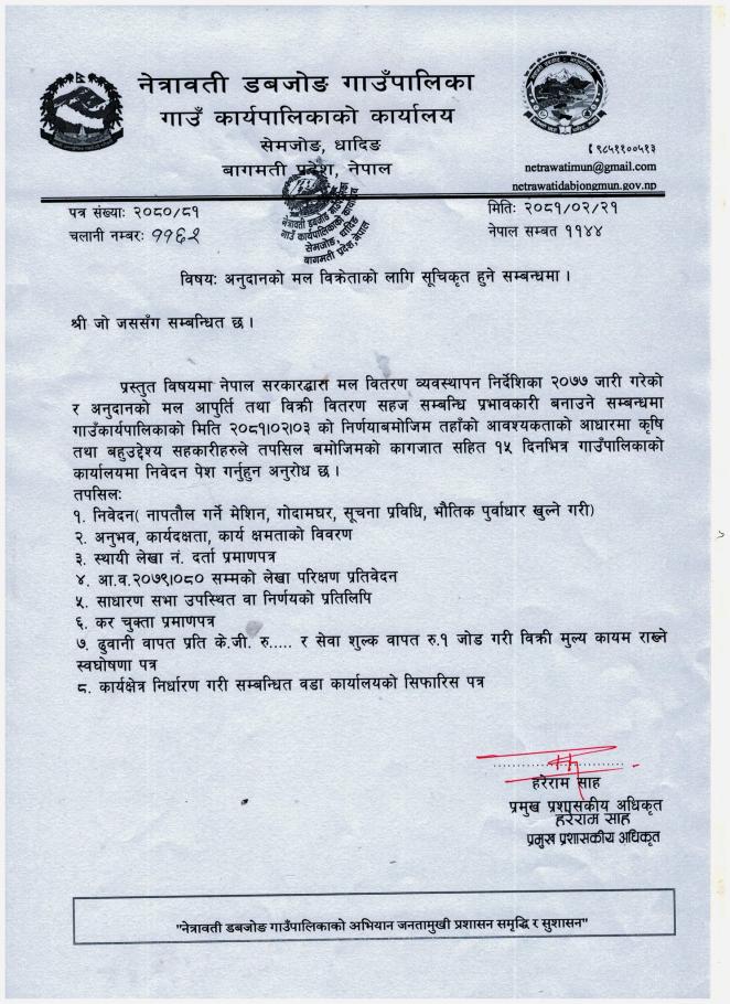 अनुदानको मल विक्रेताको लागि सूचिकृत हुने सम्बन्धमा !!