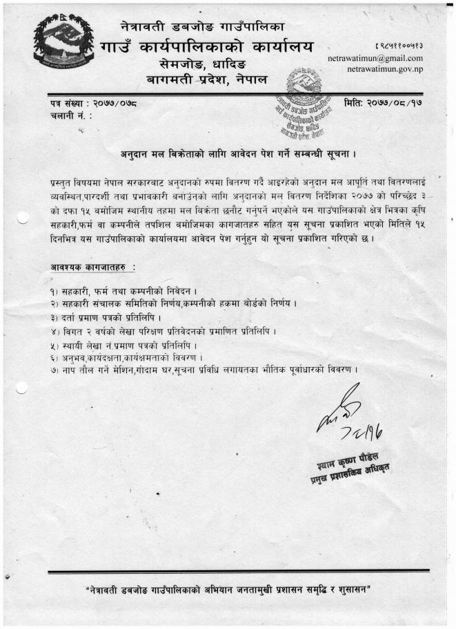 अनुदान मल बिक्रेताकाे लागि आवेदन पेश गर्ने सम्बन्धी सूचना