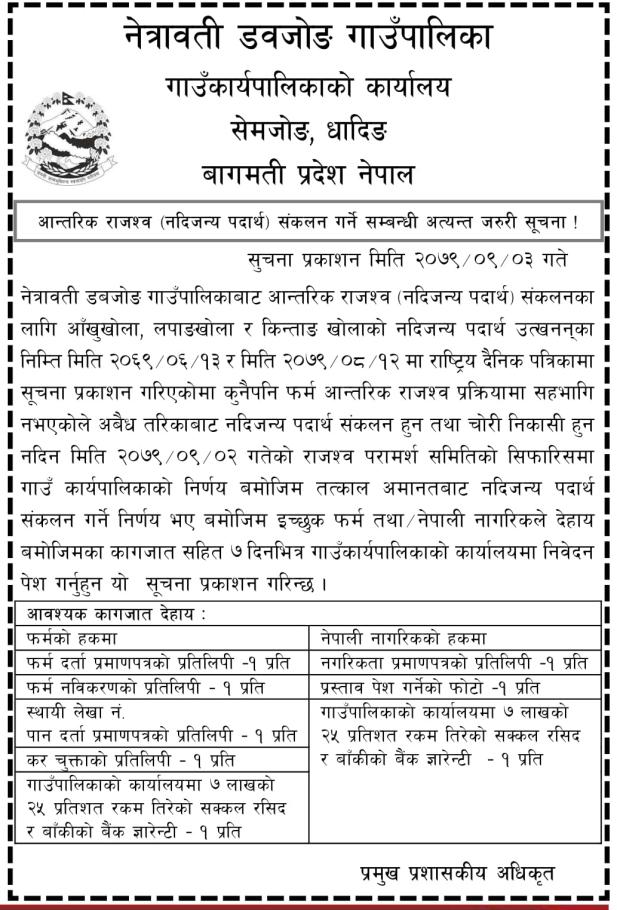 आन्तरिक राजश्व (नदीजन्य पदार्थ) संकलन गर्ने सम्बन्धी अत्यन्त जरुरी सूचना !!!