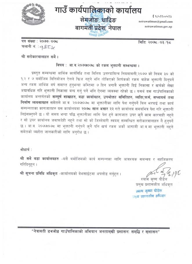आ व २०७७।०७८ काे रकम भुक्त्तानी सम्बन्धमा ।