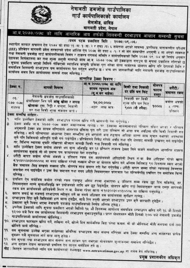 आ. व. २०७७।०७८ काे लागि आन्तरिक आय तर्फकाे शिलबन्दी दरभाउपत्र आह्वान सम्बन्धी सूचना