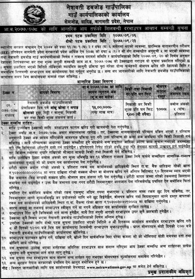 आ. व. २०७७।०७८ काे लागि आन्तरिक आय तर्फकाे शिलबन्दी दरभाउपत्र आह्वान सम्बन्धी सूचना