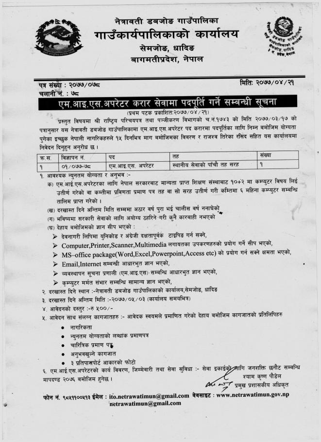 एम. आई. एस. अपरेटर करार सेवामा पदपुर्ति गर्ने सम्बन्धी सूचना ।