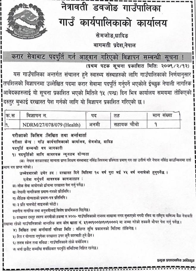 करार सेवाबाट पदपुर्ति गर्न आह्वान गरिएको विज्ञापन सम्बन्धी सूचना !!!