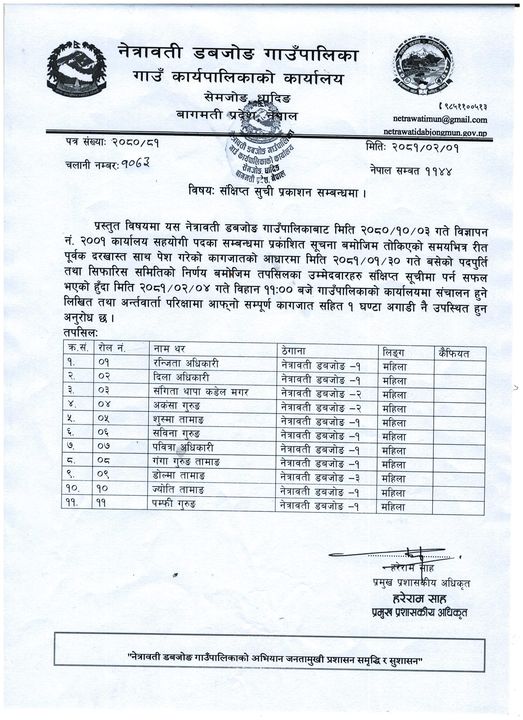 कार्यालय सहयोगी पदको संक्षिप्त सूचि प्रकाशन सम्बन्धी सूचना !!!