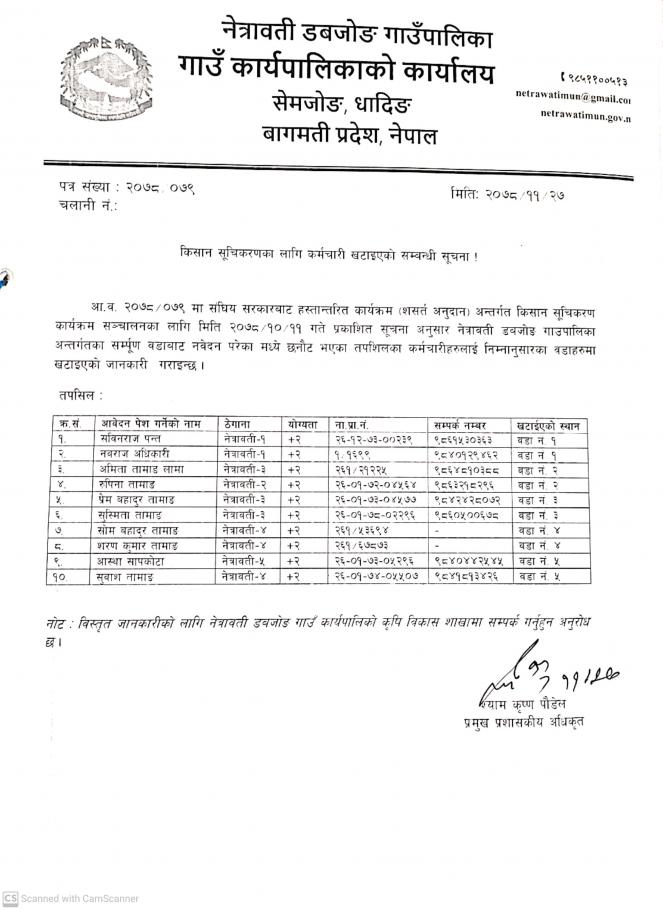 किसान सूचिकरणका लागि कर्मचारी खटाईएको सम्बन्धी सूचना !!!