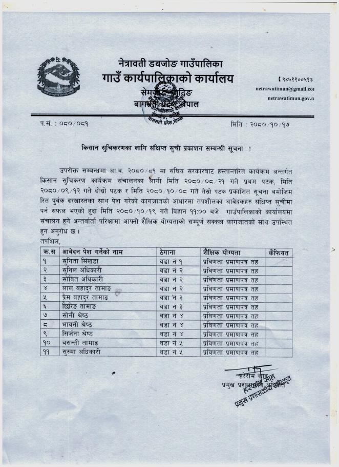 किसान सूचीकरणका लागि संक्षिप्त सुचि प्रकाशन सम्बन्धी सूचना !!!