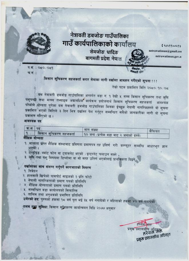 किसान सूचीकरण सहजकर्ता करार सेवाका लागि दरखास्त आव्हान सम्बन्धी सूचना !!