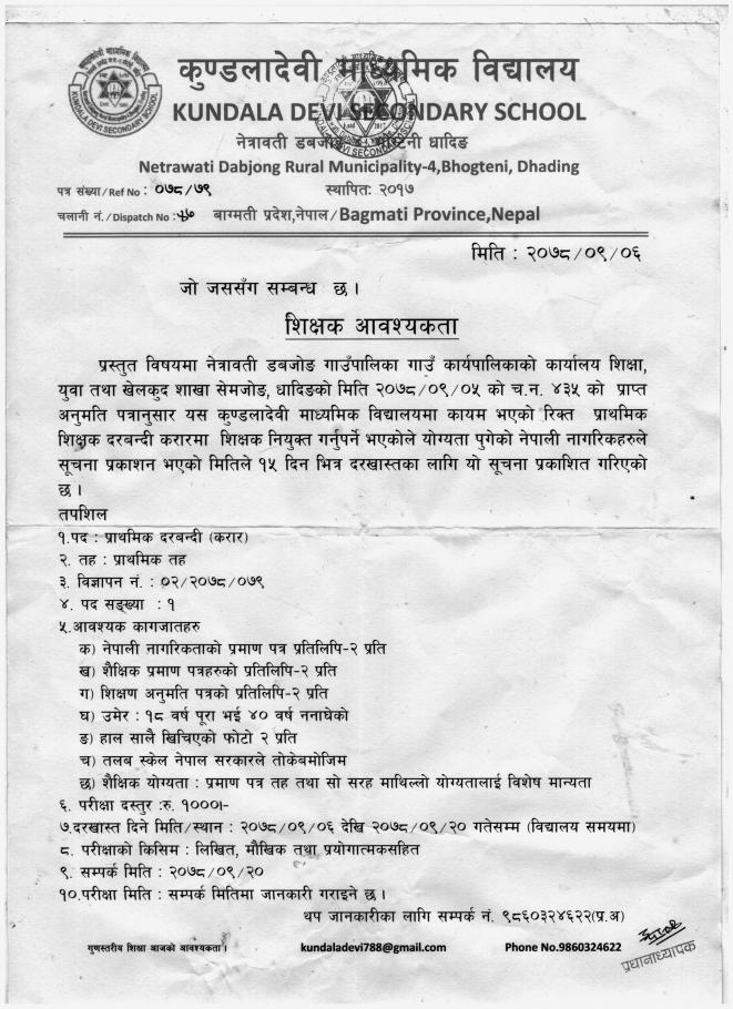 कुण्डलादेवी मा.वि.मा शिक्षक आवश्यकता सम्बन्धी सूचना !!!