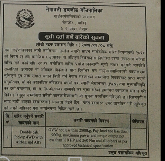 चारपाग्रे सवारी साधन खरिद सम्बन्धि सूचि दर्ता गर्ने सूचना