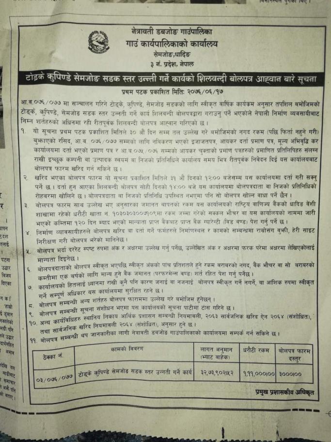 टाेड्के कुपिण्डे सेमजाेङ सडक स्तर उन्नती गर्ने कार्यकाे शिलबन्दी बाेलपत्र अाह्वान बारे सूचना ।