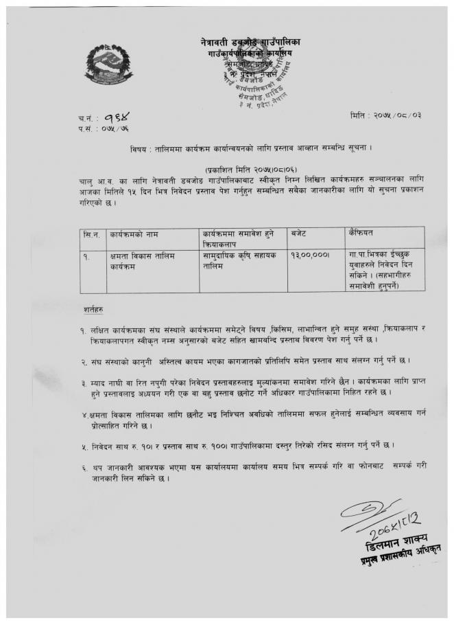 तालिम कार्यक्रम कार्यान्वयनका लागि प्रस्ताव आव्हान सम्बन्धि सूचना ।