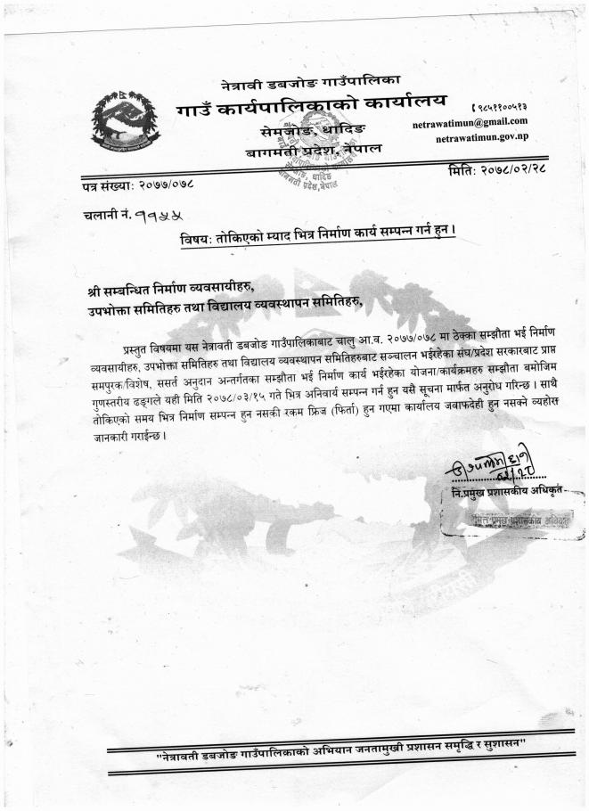 ताेकिएको म्याद भित्र निर्माण कार्य सम्पन्न गर्नुहुन सम्बन्धी सूचना ।