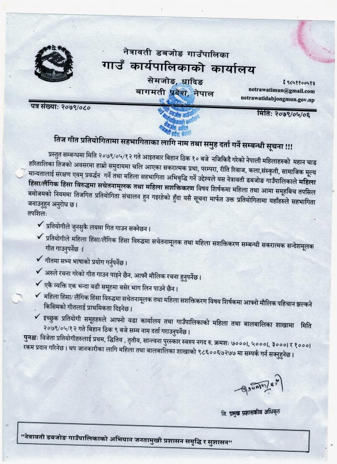 तिज गीत प्रतियोगिता सहभागिताका लागि नाम तथा समूह दर्ता गर्ने सम्बन्धी सूचना !!!