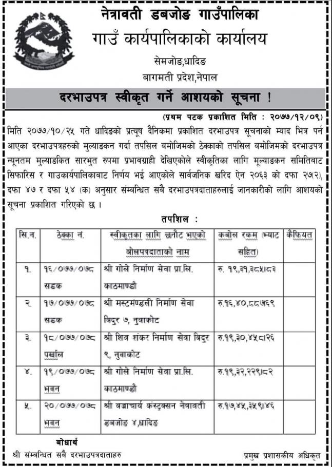 दरभाउ पत्र स्वीकृत गर्ने आशयकाे सूचना ।