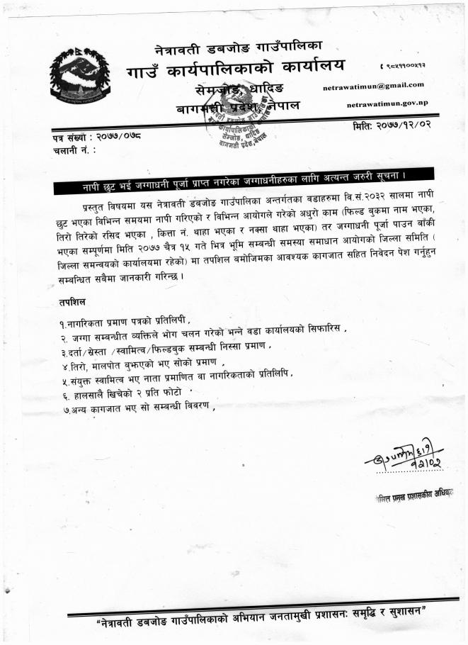 नापी छुट भई जग्गाधनी पूर्जा प्राप्त नभएका जग्गाधनीहरुका लागि अत्यन्त जरुरी सूचना ।