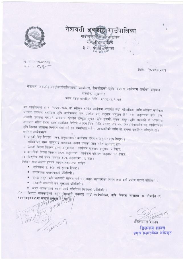 नेत्रावती डबजाेङ गाउँकार्यपालिकाकाे कार्यालय सेमजाेङकाे कृषि विकास कार्यक्रम तर्फकाे अनुदान सम्बन्धि सूचना ।