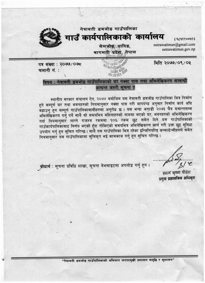 नेत्रावती डबजोङ गाउँपालिकाकाे घर नक्सा पास तथा अभिलेखिकरण सम्बन्धी अत्यन्त जरुरी सूचना ।