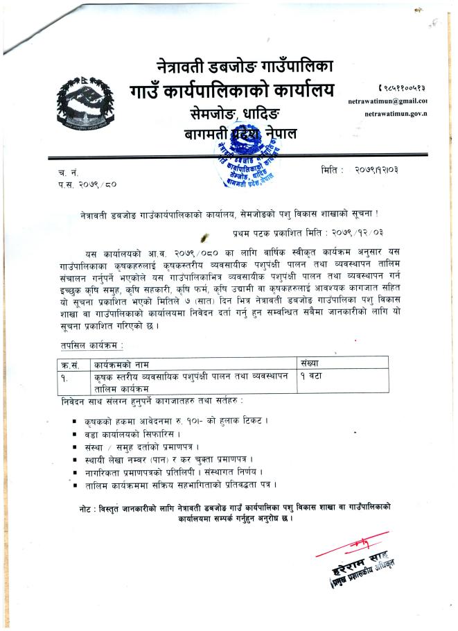 नेत्रावती डबजोङ गाउँपालिकाको पशु विकास शाखाको सूचना !!