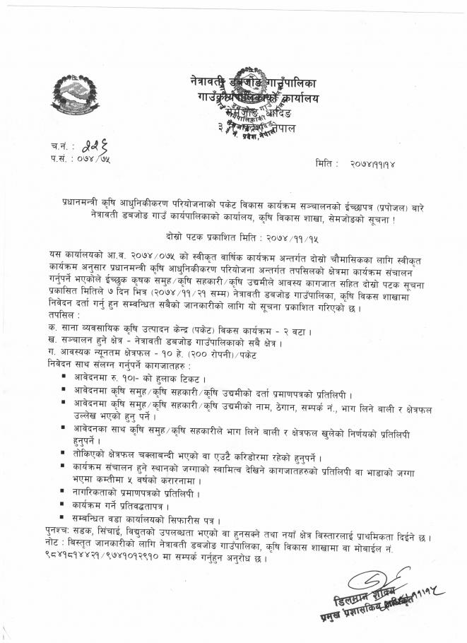 पकेट क्षेत्र विकास सञ्चालन गर्न प्रपाेजल माग गरिएकाे कृषि विकास शाखाकाे सूचना