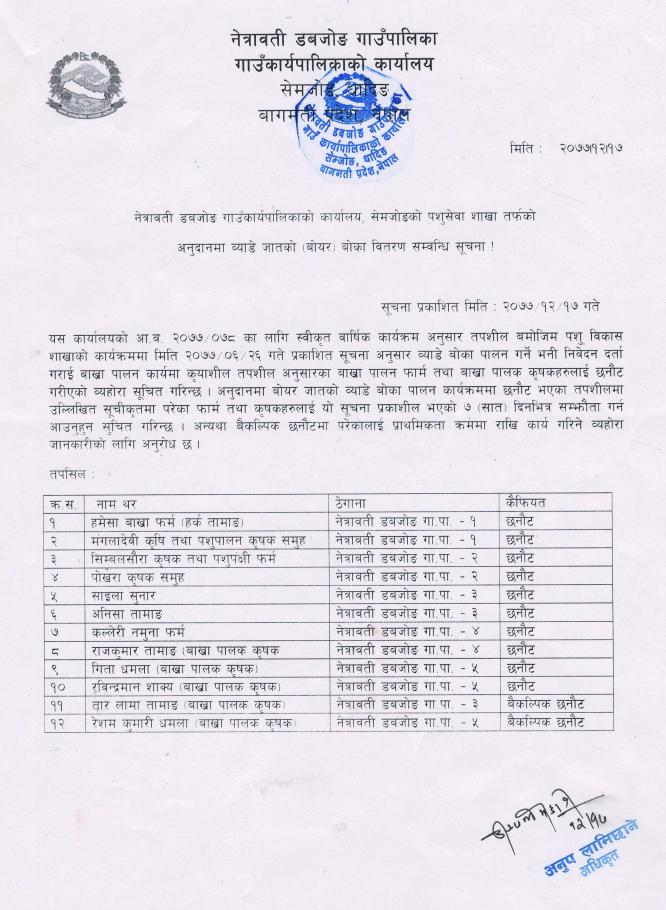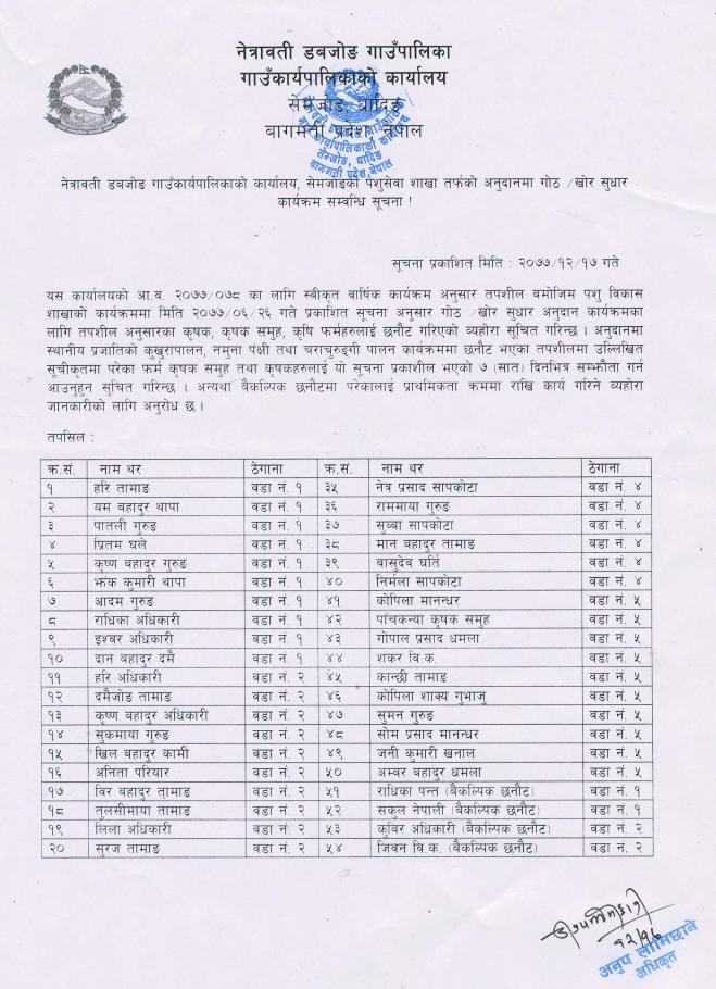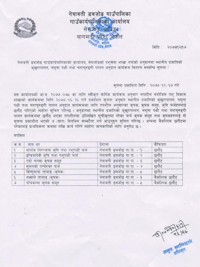 पशु सेवा शाखा तर्फकाे विभिन्न अनुदान वितरण कार्यक्रम सम्बन्धी सूचना ।