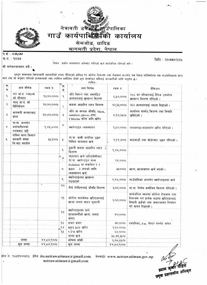 प्रकाेप व्यवस्थापन काेषबाट गरिएकाे खर्च सम्बन्धमा ।