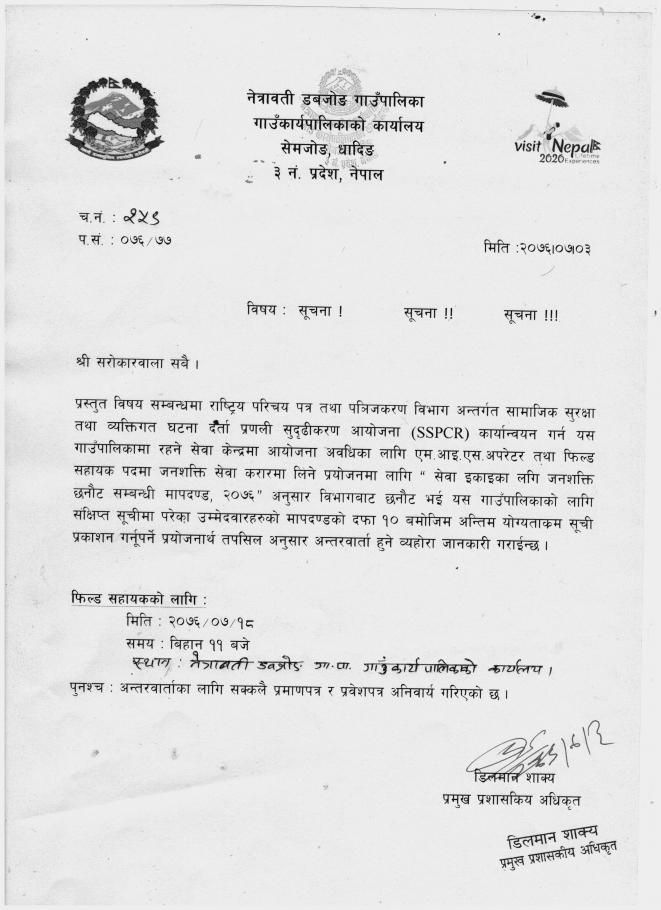 फिल्ड सहायक पदका लागि अन्तरवार्ता हुने बारे सूचना !
