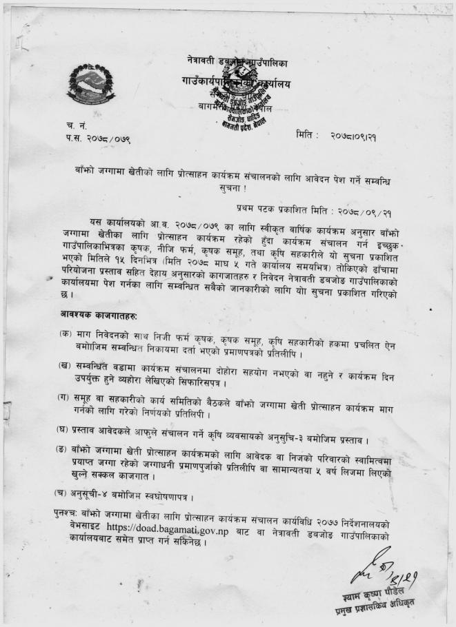 बाँझाो जग्गामा खेतीको लागि प्रोत्साहन कार्यक्रम सञ्चालनको लागि आवेदन पेश गर्ने सम्बन्धी सूचना !!!