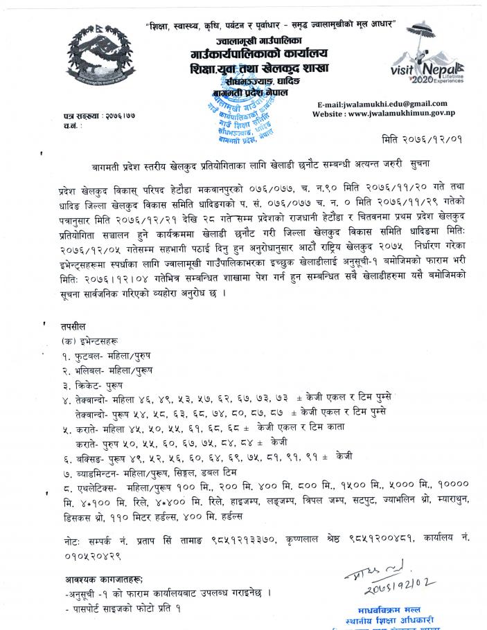बागमती प्रदेश स्तरीय खेलकुद प्रतियोगिताका लागि खेलाडी छनौट सम्बन्धी अत्यन्त जरुरी सूचना ।