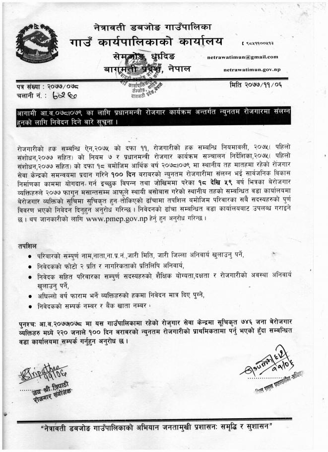 राेजगारमा संलग्न हुनकाे लागि निवेदन दिने बारे सूचना