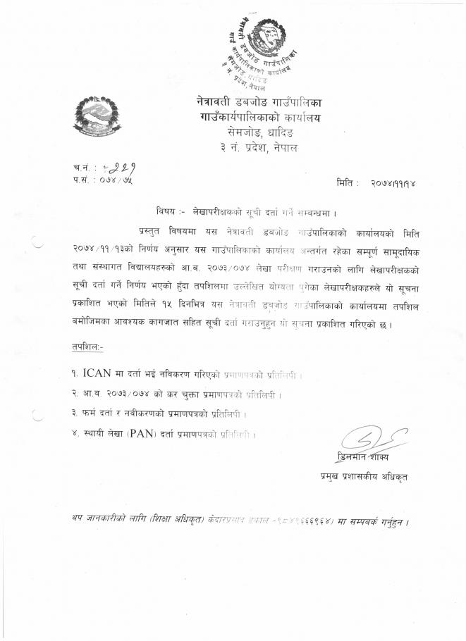 लेखापरिक्षककाे सूचि दर्ता गर्ने सम्बन्धि १५ दिने सूचना