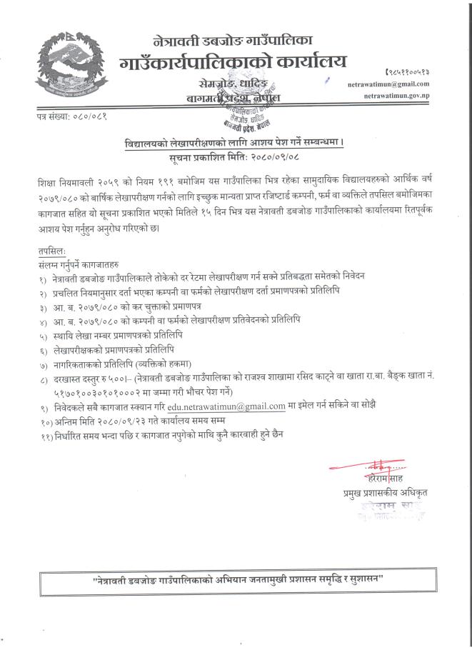 विद्यालयको लेखापरीक्षणको लागि आशय पेश गर्ने सम्बन्धी सूचना !!!
