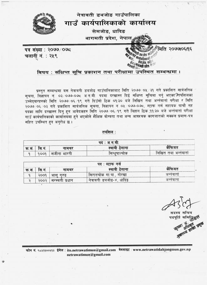 संक्षिप्त सूचि प्रकाशन तथा परीक्षामा उपस्थित हुने सम्बन्धी सूचना ।