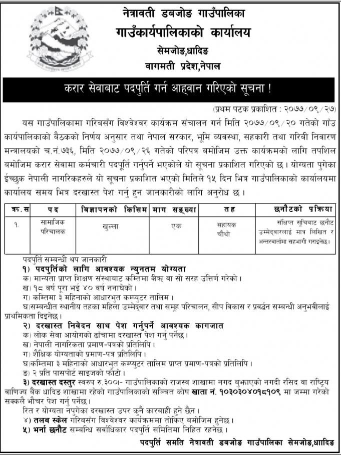 सामाजिक परिचालक करार सेवाबाट पदपुर्ति गर्न आह्वान गरिएकाे विज्ञापन सम्बन्धी सूचना ।