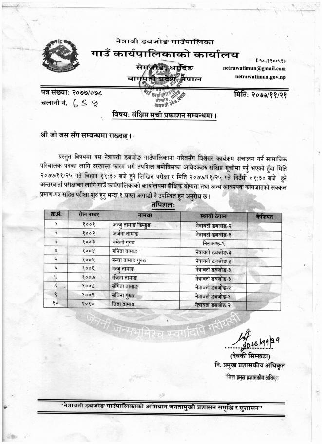 सामाजिक परिचालक पदकाे संक्षिप्त सूची प्रकाशन सम्बन्धी सूचना ।