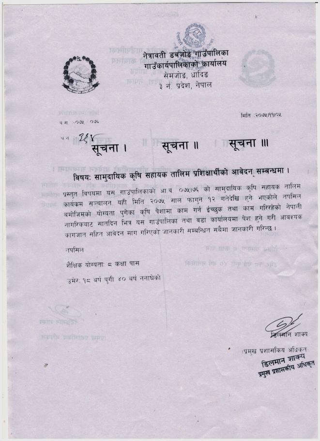 सामुदायिक कृषि सहायक तालिम प्रशिक्षार्थिकाे आवेदन सम्बन्धि सूचना
