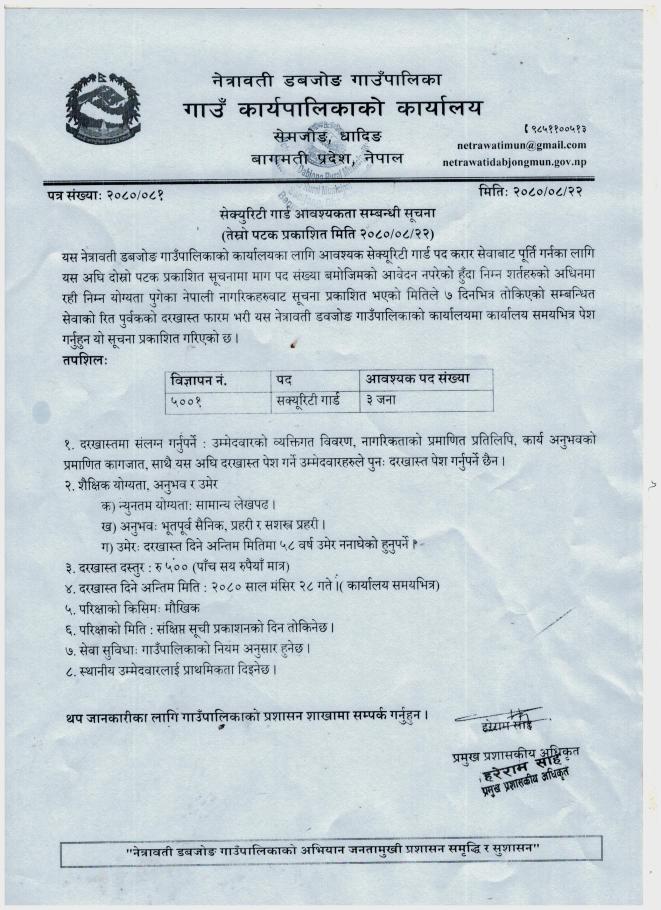 सेक्युरिटी गार्ड आवश्यकता सम्बन्धी सूचना !!