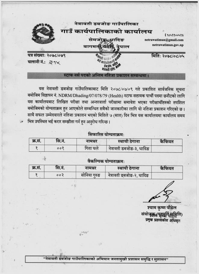 स्टाफ नर्स पदकाे अन्तिम नतिजा प्रकाशन सम्बन्धी सूचना !!!