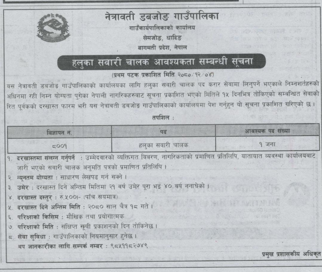 हलुका सवारी चालक आवश्यकता सम्बन्धी सूचना !!