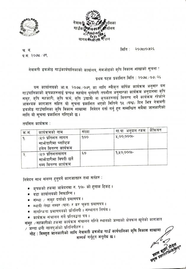 ५० प्रतिशत लागत साझेदारी सम्बन्धी कृषि विकास शाखाकाे सूचना !!!