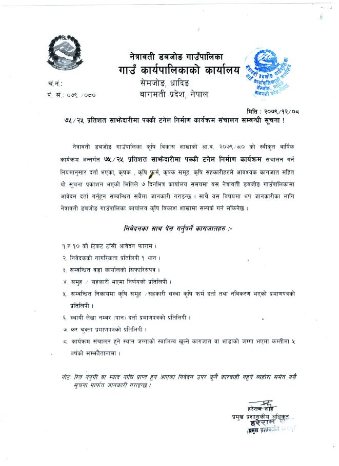 ७५/२५ प्रतिशत साझेदारीमा पक्की टनेल निर्माण कार्यक्रम सम्बन्धी सूचना !!!